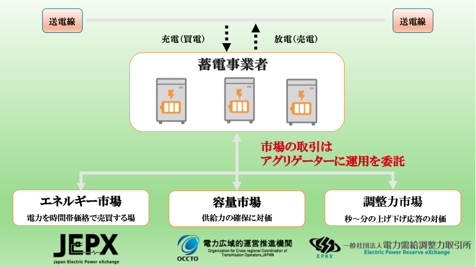 主な収益源は需給調整市場(周波数・需給バランス調整)、容量市場(供給力価値の確保)、および卸電力取引の時間差(チャージ/ディスチャージによるスプレッド)です。案件ごとに最適な組み合わせを設計し、アグリゲーターが運用を担います。